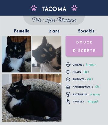 Salut ! Moi c’est Tacoma, une femelle d'environ 2 ans au pelage noir et blanc et de petite taille. J'ai été une très bonne maman qui s'occupait bien de ses bébés. Maintenant que je suis stérilisée, il est temps pour moi de trouver un doux foyer pour vivre tranquillement. Je suis douce, plutôt sociable, propre et assez discrète.