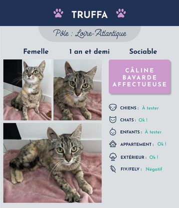 Salut ! Moi c’est Truffa, une jeune chatte d’un an et demi. Je suis adorable, j’adore les caresses et je vais souvent chercher ma famille d’accueil pour des caresses. La vie dehors n’a pas été facile ce qui fait que je suis un peu timide au début, mais quand je me sens en confiance je suis une crème. Je suis une chatte parfaite qui vous tiendra compagnie, vous demandera plein de papouilles et vous donnera beaucoup d’amour. Je suis propre et je joue parfois avec des jouets que ma famille d’accueil m’a donnés.