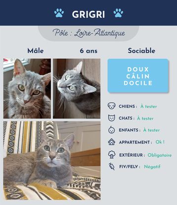 Bonjour. Je m'appelle Grigri parce que celui qui m'a trouvé pense que je porte bonheur mais également parce que c'est la couleur de mon pelage.