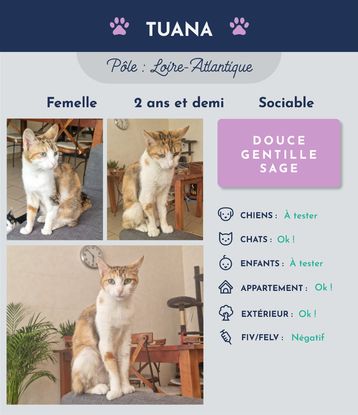 Bonjour, je suis Tuana, une jolie chatte tricolore de 2ans et demi. Je suis un petit format d'un peu plus de 3kg. Je suis douce, gentille et sage. J'ai un bon caractère et je m'entends avec les autres chats. Pour les enfants et les chiens, je ne connais pas.