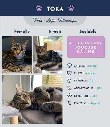 Salut, moi c’est Toka ! Je suis une chatte qui aime la compagnie, et vous pourrez l’entendre à mes ronronnements ne serait-ce qu’en dormant à vos pieds. Grande sportive, je pratique le salto, l’escalade et le saut en hauteur. Je m’entraîne en attrapant des balles, ou en grimpant sur mon arbre à chat. J’y fais également mes siestes tout en vous observant. Belle au naturel, je peux me pavaner devant vous en attendant que vous m’adoptiez.