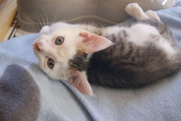Chaton mâle, type Européen, coloris blanc et tigré. Age : environ 6 semaines.