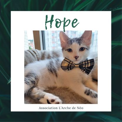 Hope sera placé identifié par puce électronique, déparasité (puces et vers), avec la première injection (typhus, coryza ET leucose). Sa stérilisation est OBLIGATOIRE et à votre charge toutefois l'association rembourse 50% des frais engagés sur facture. La stérilisation doit être faite AU PLUS TARD à 6 mois.