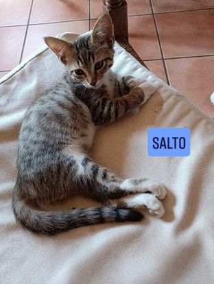 SALTO est un chaton de 3 mois plein de vie et très joueur. Il adore être pris dans les bras pour des grands moments de ronrons.