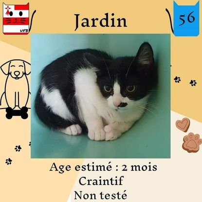 jardin est un mâle de 2 mois craintif (un comportement normale en fourrière) qui vous attend dans une fourrière du 56. ATTENTION SORTIE AU PLUS TARD LE 26/08/2022 (avant euthanasie) !