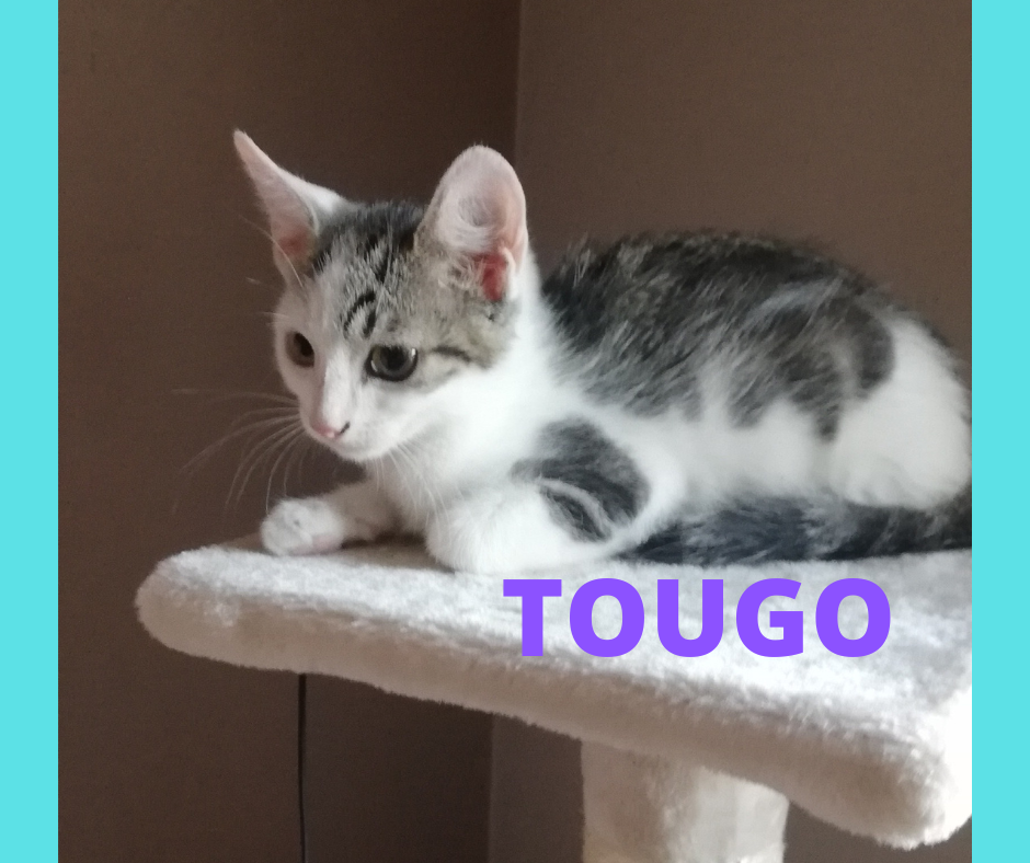 Il est arrivé dans le jardin de sa famille d'accueil actuelle avec 8 autres chatons, venant de 2 portées différentes, TOUGO fait partie des derniers à ne pas trouver sa famille. Son frère dont il etait très proche a été adopté et il peut maintenant s épanouir tout seul.