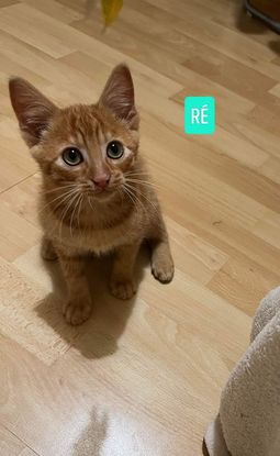 RÉ : chaton tigré roux de deux mois, timide mais très joueur et gourmand. Ré commence petit à petit à se familiariser à son espace et prend ses marques.