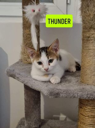 Thunder suit son frère partout et adore embêter sa sœur. Son jeu préféré est le saut en longueur dans sa litière. Il joue beaucoup mais fuit dès qu'un humain entre dans la pièce. Il n'hésite pas à sortir les griffes si vous l'attraper.