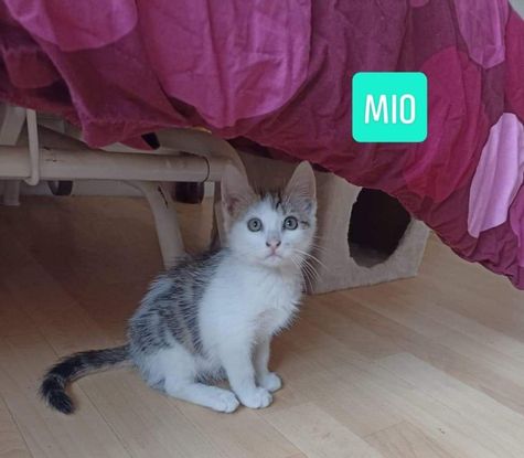 Mio, petit chaton de 2 mois, il est joueur, gourmand et curieux. Un peu craintif aux premiers contacts, il faudra du temps pour l'apprivoiser.
