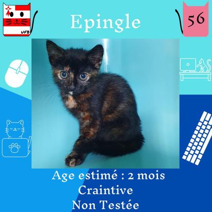 Epingle est une femelle de 2 mois craintive (un comportement normal en fourrière) qui vous attend dans une fourrière du 56. ATTENTION SORTIE AU PLUS TARD LE 2/09/2022 (avant euthanasie) !