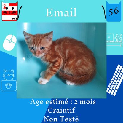 Email est un mâle de 2 mois craintif (un comportement normal en fourrière) qui vous attend dans une fourrière du 56. ATTENTION SORTIE AU PLUS TARD LE 2/09/2022 (avant euthanasie) !