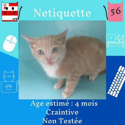 Netiquette est une femelle de 4 mois craintive (un comportement normal en fourrière) qui vous attend dans une fourrière du 56. ATTENTION SORTIE AU PLUS TARD LE 2/09/2022 (avant euthanasie) !