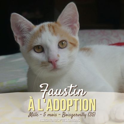 Faustin est un chaton calme et un peu plus timide que ses frères et sœurs, il a besoin de patience et de douceur, et la présence d'un autre chat avec lui le rassure beaucoup : il est beaucoup plus à l'aise avec un copain ou un tonton chat. Il se laisse tenter par le jeu facilement, c'est un bon moyen de le mettre en confiance avec les personnes qu'il ne connaît pas. Il choisit ses moments câlins et apprécie les caresses. Il adore se prélasser au soleil et ronronne à outrance, c'est un ronronneux ! Il est habitué aux enfants en bas-âge.