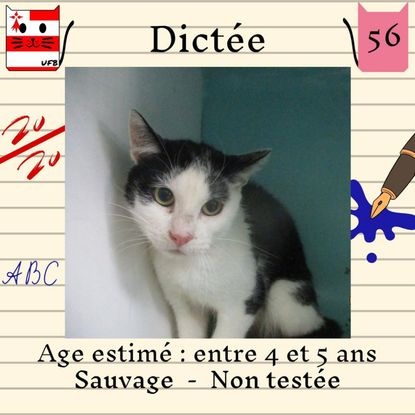 Dictée est une femelle de 4-5 ans sauvageonne (un comportement normal en fourrière) qui vous attend dans une fourrière du 56. ATTENTION SORTIE AU PLUS TARD LE 9/09/2022 (avant euthanasie) !