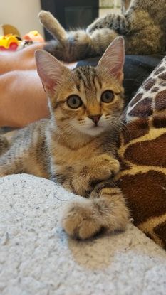 Calypso est une jolie tigrée née le 25/04/22. Elle est arrivée avec ses 2 frère et soeur eux aussi handicapés. Elle est née avec une malformation des 2 pattes avant dite "TwistyCat". Cela ne l'empêche pas de vivre quasi normalement, elle se tient toujours, au repos, sur l'arrière de son corps comme un petit suricate Il faudra faire attention à ce qu'elle ne puisse pas grimper trop haut et donc soit obligée de sauter et se réceptionner sur l'avant de son corps au risque de se casser une patte. Étant un chaton biberonné, elle est très pot de colle, c'est la plus débrouillarde et la plus indépendante de sa portée. Elle vit avec d'autres chats, des chiens et des enfants. Elle peut être adoptée en duo avec sa soeur Shansa, un autre de nos chatons, ou dans un foyer ayant déjà au moins un chat très sociable comme elle.