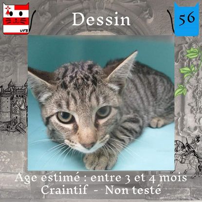 Dessin est un mâle de 3-4 mois craintif (un comportement normal en fourrière) qui vous attend dans une fourrière du 56. ATTENTION SORTIE AU PLUS TARD LE 16/09/2022 (avant euthanasie) !