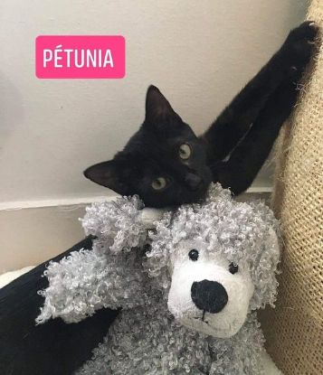 PÉTUNIA est une petite chatte noire d'environ 3 mois et demi. Cette ravissante petite panthère a été trouvée dans le jardin d’une vielle dame amie des chats alors qu’elle devait avoir à peine un mois. Elle l’a gardé chez chez elle en compagnie de ses aitres chats, elle etait extrêmement timide . Elle avait pour habitude de venir se coucher sur les genoux pour profiter de quelques caresses. Si Pétunia est encore timide quand elle ne connaît pas, elle se laisse facilement séduire par le plumeau. Et elle adore la compagnie des autres chats avec qui elle joue avec grand plaisir (au point d’épuiser ses compagnons de jeu). Une fois en confiance elle se laisse caresser et ronronne de plaisir. Une vraie perle noire qui saura vous charmer !