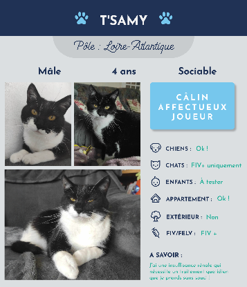 Hello, je suis T'Samy et j'ai 4 ans ! Je suis un chat noir et blanc, je suis un peu craintif au début mais vous inquiétez pas je prends très vite mes marques !! J'aime avoir de l'attention : quand je veux avoir des câlins, je me fais bien comprendre ! Je m'assois sur votre torse et je pose ma petite patte dans votre cou, croyez-moi c'est la meilleure technique pour avoir des caresses hehe !