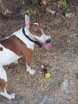 NADIA femelle bull terrier – 5 à 6 ans – environ 20 kg et 40/45 cm au garrot – OK congénères – OK enfants – pas OK chats – affectueuse, joueuse – très sociable avec ses congénères et les humains – très câline – positive à la leishmaniose (taux faible) et sous traitement (Allopurinol) mais leishmaniose stabilisée A L'ADOPTION NADIA a été trouvée errante, dans un état de malnutrition avancée (ventre gonflé comme si elle attendait des bébés), il y a environ 2 ans.