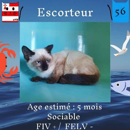 Escorteur est un mâle de 5 mois sociable FIV+ qui vous attend dans une fourrière du 56. ATTENTION SORTIE AU PLUS TARD LE 30/09/2022 (avant euthanasie) !