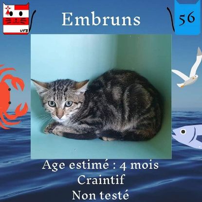 Embruns est un mâle de 4 mois craintif (un comportement normal en fourrière) qui vous attend dans une fourrière du 56. ATTENTION SORTIE AU PLUS TARD LE 30/09/2022 (avant euthanasie) !