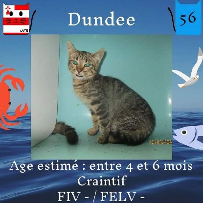 Dundee est un mâle de 4-6 mois craintif (un comportement normal en fourrière) qui vous attend dans une fourrière du 56. ATTENTION SORTIE AU PLUS TARD LE 30/09/2022 (avant euthanasie) !