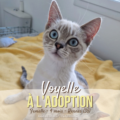 Voyelle est une chatonne avec une sacré personnalité. Elle porte ce nom car la dame qui veillait sur elle disait toujours ""tu es un petit voyou toi !"". Voyelle n'a pas froid aux yeux, c'est une petite chatonne intrépide, curieuse, entêtée, ronronneuse qui se fait remarquer à coup sûr et sait attirer l'attention sur elle. Toujours très présente, c'est la première qui vient vers nous et qui monte sur nos genoux, fouine dans nos affaires... un vrai zébulon ! Elle aime beaucoup la présence de ses copains mais peut s’accommoder en chat unique, tant qu'elle a des activités variées, et qu'on s'occupe d'elle, c'est tout ce qui compte. Voyelle n'attend plus que son foyer pour la vie.... Née dehors, et passé les premiers mois de sa vie dehors... ça lui a bien suffit !
