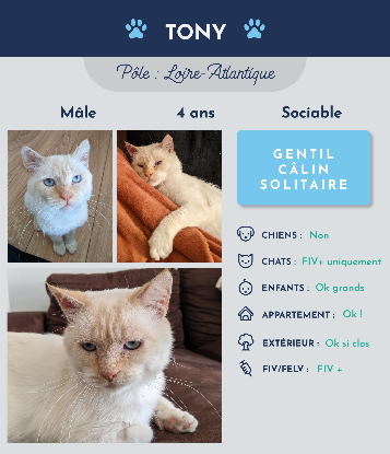 Bonjour, moi c'est Tony, 4 ans et des poussières ! Je suis un mâle blanc et crème, avec de jolis yeux bleus. De nature calme, j'aime passer mes journées posé dans un coin. Je suis un peu solitaire et j'ai besoin de faire confiance, mais avec le temps, je sais aller vers les humains, surtout s' ils font le premier pas en venant me gratouiller la tête (j'adore ça !) ! Je ne suis pas très joueur donc je n'ai jamais fait de bêtise !