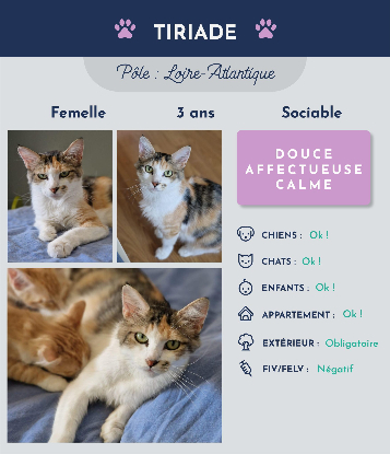 Salut, je m'appelle Tiriade et je suis une chatte de 3 ans. Je suis douce et j'aime beaucoup les câlins. Je n'ai pas l'habitude d'être dans les bras mais je peux apprendre. Je peux m'entendre avec les autres chats et les chiens ne m'effraient pas. J'ai absolument besoin d'un jardin.