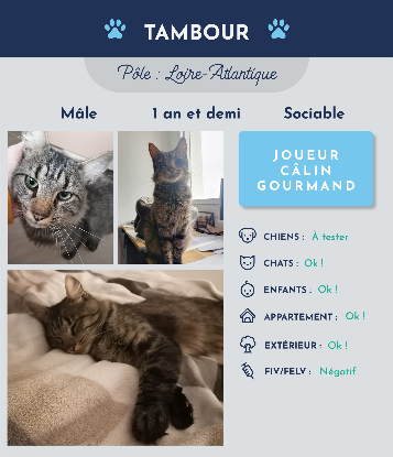 Moi c'est Tambour, j'ai environ 1 an et demi (bon, ça reste entre nous mais je suis de petite taille) et je suis ici pour trouver ma famille pour la vie !
