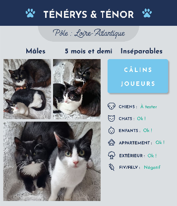 Nous sommes Ténérys et Ténor, 2 beaux mâles de 5 mois et demi. Moi, Ténor, je ronronne tout le temps et j'aime vous suivre partout. J'ai de beaux yeux verts avec du bleu autour des pupilles. Moi, Ténérys, je suis un beau chat noir à poils longs avec du blanc au bout des pattes. Je suis trop craquant. J'ai encore un peu peur alors je suis plus en retrait. Nous sommes toujours collés l'un à l'autre alors nous ne pourrons pas être adoptés séparément. Nous sommes tellement mignons que nous nous entendons très bien avec les autres chats et sans nul doute avec les enfants également, même si nous n'en avons encore jamais rencontrés. Il ne nous reste plus qu'à trouver notre petite famille.