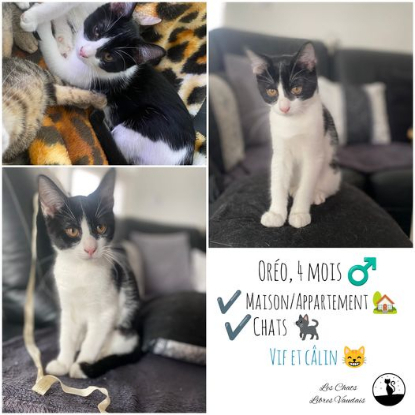 Oréo serait heureux avec une famille et des enfants, il serait aussi heureux en appartement ou en maison, et nous savons qu'il aime la compagnie de ses congénères chats. Autrement dit, Oréo n'est pas bien difficile, ce qu'il demande se résume en deux mots : beaucoup d'amour ❤