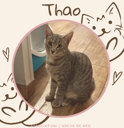 Thao sera placé identifié par puce électronique, déparasité (puces et vers), avec la première injection (typhus, coryza ET leucose). Sa stérilisation est OBLIGATOIRE et à votre charge toutefois l'association rembourse 50% des frais engagés sur facture. La stérilisation doit être faite AU PLUS TARD à 6 mois.