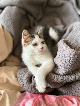 Spider est un petit chaton de 2 mois et demi abandonné dans un hall d'immeuble où il est resté 2 jours.