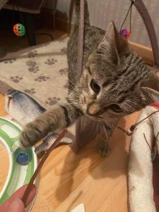 Notre jolie chatonne tigrée a fait de gros gros progrès de sociabilisation ! Elle vient désormais réclamer des calins, elle se laisse même caresser le ventre !! Elle est très douce et ne sort pas les griffes. Elle n'est pas agressive du tout Elle vient chercher ses friandises auprès de sa Fa et c'est une gourmande !!