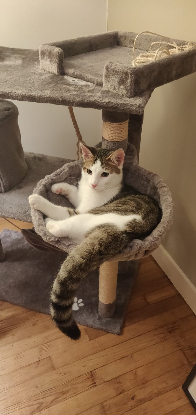 De fait, cette boule d'énergie attend tout juste que les lampadaires de la ville s'allument à 6h du matin pour venir nous réveiller à coups de ronrons autour du visage. Autrement, il aime passer ses journées à cavaler derrière ses jouets et à être en compagnie d'autres humains ou félins (qu'il n'hésite d'ailleurs pas à réclamer avec des miaulements et regards irrésistibles).