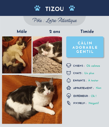 Chalut, moi c'est Tizou ! Je suis un très beau chat gris et blanc, gentil mais un peu peureux !