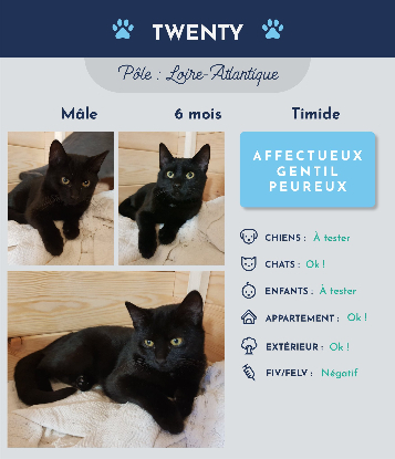 Salut moi c’est Twenty, je suis un grand timide, il faudra de la douceur et un peu de patience pour m’apprivoiser. Lorsque quelqu’un arrive dans la pièce je me cache, mais s’il y reste un moment, alors je pointe le bout de mon nez.