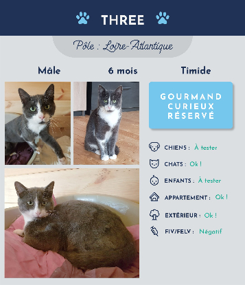 Salut moi c’est Three, je suis un joli chat très expressif, je sais très bien me faire comprendre. Je suis timide mais tellement gourmand que vous disposez d’une arme facile pour m’apprivoiser. Il suffit de me tendre quelques friandises pour me faire venir et pouvoir me caresser.