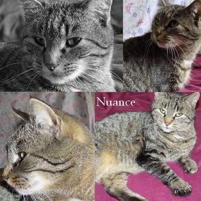 Nuance 1 et demi FIV + La belle cherche une famille aussi gentille et aimante qu'elle et cette fois ci pour la vie. Avec son allure de matou et sa jolie corpulence, Nuance est une "petite" pipelette, touchante et attachante. Gourmande. On ne connait pas encore ses ententes avec les autres animaux (sa viendra après sa mise en règle). Frais d'adoption: 60€