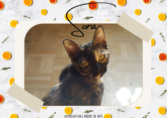 Sora a été sauvée avec sa mère et ses 5 frères et soeurs. Elle est arrivée à 6 mois et demandera de la patience et du temps pour entrer en relation avec l'homme mais c'est une chatte qui cache un grand coeur et beaucoup de sensibilité.