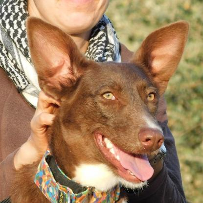 Jolie est une podenca fofolle qui avec un regard intense, des yeux incroyables, et un pelage chocolat tout en contraste, elle est magnifique. C'est une jeune chienne qui, malgré une formidable envie de jouer, est très délicate dans son box et ne salit ni ne déplace aucune de ses couvertures. Elle s'amuse avec n'importe quel stimulus, bâton ou jouet. C'est un plaisir de voir comme elle accepte bien les nouveautés : la laisse, la collerette... Au début, elle avait un peu peur mais cela ne durait que quelques secondes, puis elle a rapidement assimilé qu'il ne lui arrivait rien et les accepte parfaitement.