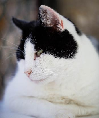 Cet adorable minou a été trappé sur un site de nourrissage à Chevilly La Rue. Soigné pour une otite et opéré afin de lui retirer un polype, il s'est vite remis néanmoins il a gardé sa petite tête légèrement penchée, ce qui lui donne un petit air coquin et suppliant. Testé FIV+ cela ne l'empêche pas de vivre normalement et il n'y a aucun risque pour l'humain