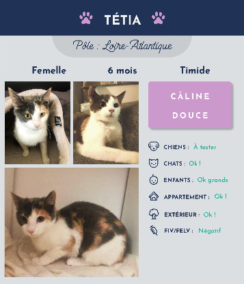 Je me présente Tétia, j’ai 6 mois. Je suis une jolie chatonne tricolore bleu crème. Timide, je me cache, cependant si vous me caressez je ronronne de plaisir ! Je recherche une famille calme et aimante. Apprenez moi à jouer, explorer, prendre confiance et voir la vie en rose.