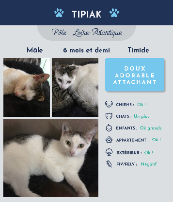 Bonjour ! Je m’appelle Tipiak, je suis un magnifique chaton d’environ 6 mois et demi au pelage blanc et un peu tigré.