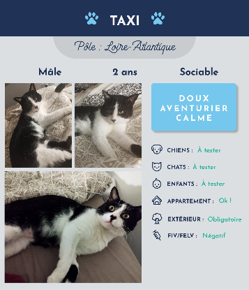 Coucou ! Moi c'est Taxi ! Je suis un gentil mâle de 2 ans. Je suis costaud d'apparence, mais je suis une vraie boule d'amour ! J'adore les câlins et être proche de mon humain. Je suis aussi un vrai chaventurier j'aime gambader et me prendre pour un vrai chasseur ! Les moustiques sont mes proies préférées ! J'ai besoin d'espace pour m'épanouir et de beaucoup d'amour.
