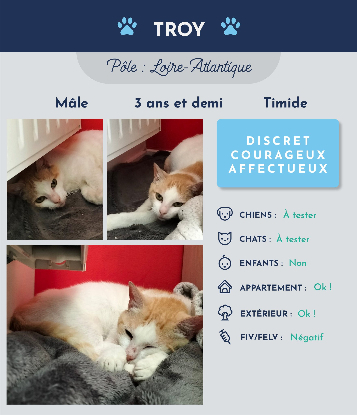Je n'ai pas eu une vie facile alors je cherche un foyer bienveillant, confortable et calme. Je suis discret, un peu craintif mais j'adore les câlins. Je me mets souvent dans des petits coins pour être tranquille mais je ronronne fort si on me caresse.