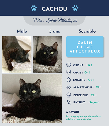 Bonjour, moi c’est Cachou, un adorable loulou de 5 ans qui adore les câlins ! Ce que je préfère, c’est venir me blottir contre vous, ça me rassure car j’ai besoin de présence. Ma petite particularité c’est que je suis atteint d’une gingivite qui demande un suivi vétérinaire régulier (injection de cortisone toutes les 6 semaines). Je vous fais confiance pour prendre soin de moi !