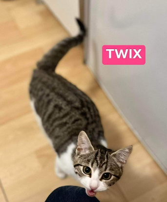 Twix est une petite chatonne propre et douce qui a un miaulement mélodieux. Elle sait réclamer des caresses en ronronnant et est très friande de pâtée.