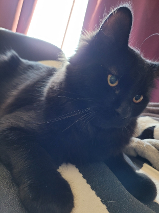 Twix est un chat noir à poils mi-longs de 6 mois. Son pelage est extrêmement soyeux et brillant. Il est gentil et câlin.